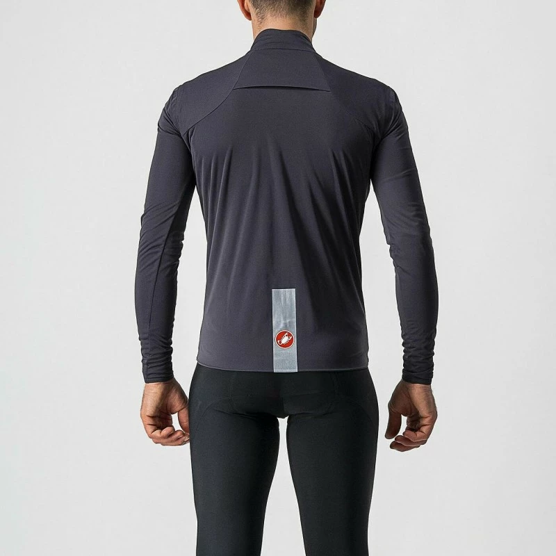 Elle est sensée faire office de shell pour la pluie si vous la portez par dessus un maillot, nous avons donc renoncé aux poches extérieures et privilégié une construction simple pour minimiser le nombre de coutures. Elle est dotée d’une ventilation à l’arrière pour éviter la surchauffe, d’une fermeture éclair couverte contre les éclaboussures et d’éléments réfléchissants pour votre sécurité.